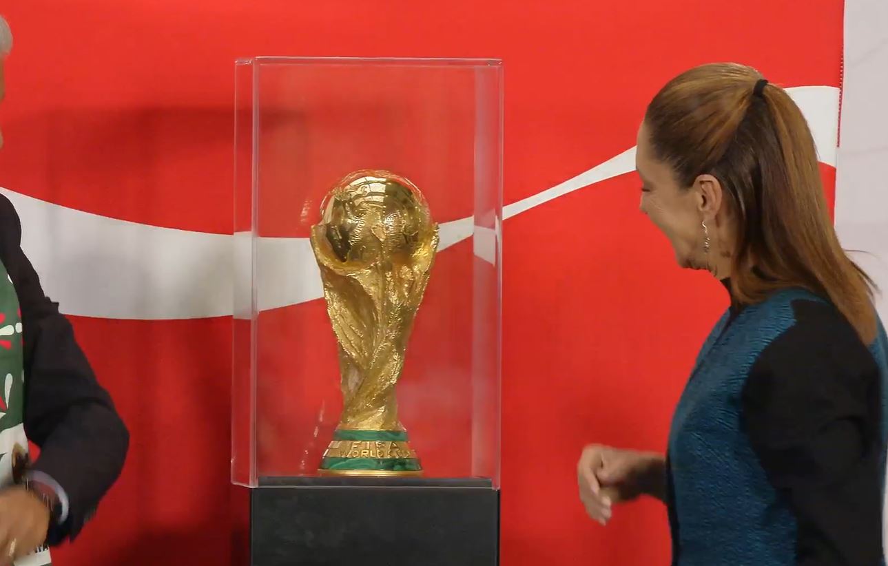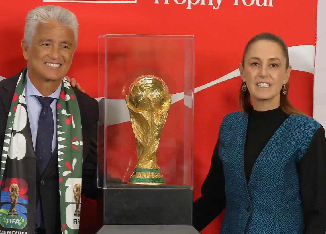El trofeo llegó como parte de la gira internacional «Trophy Tour» y aterrizó primero en el Aeropuerto Internacional Felipe Ángeles. Para este acto, Sheinbaum Pardo sostuvo entre sus manos el trofeo original que pasó por las manos de leyendas con Zinedine Zidane o Pelé. Esto último representa la antesala del evento más importante del futbol mundial.